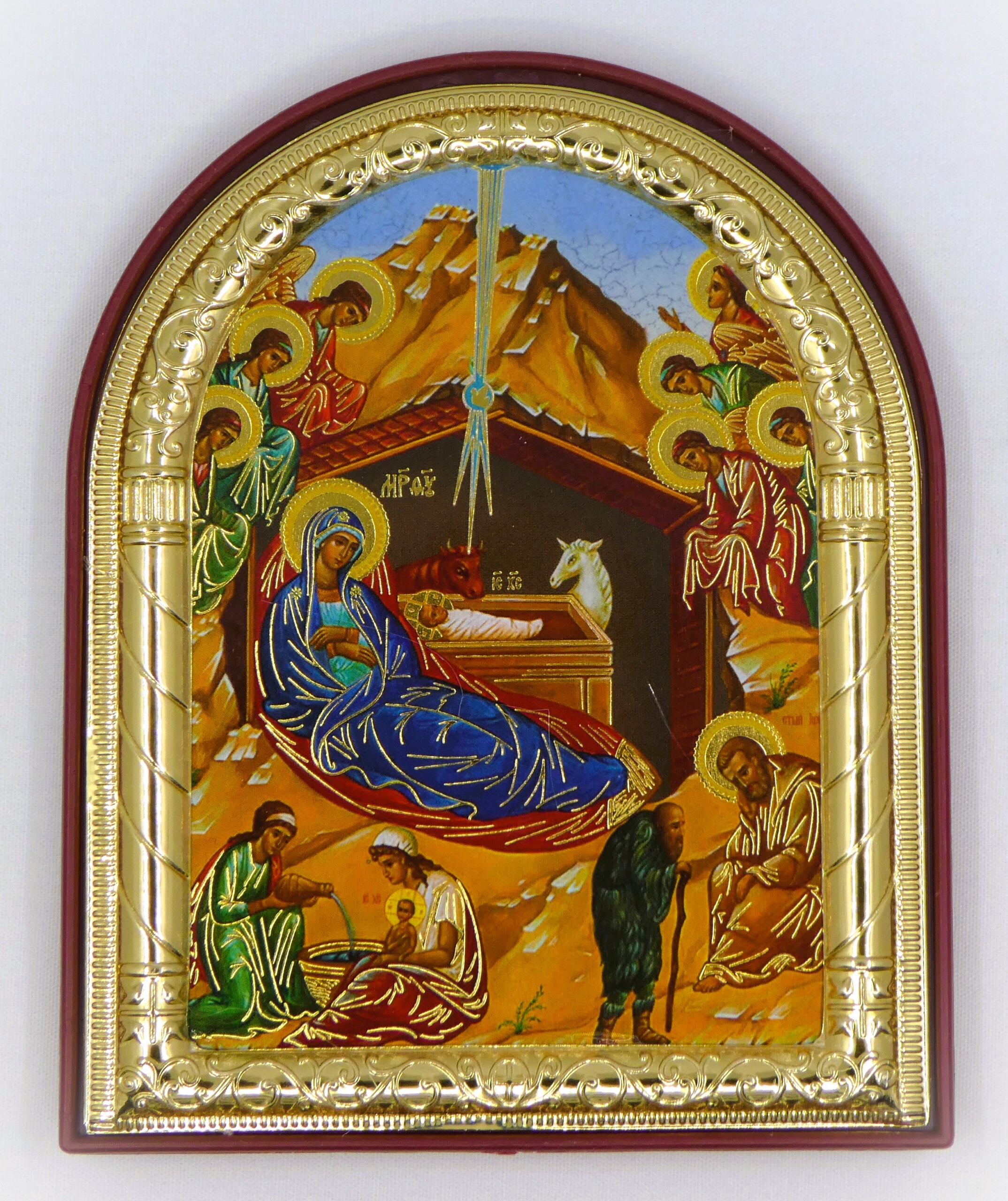 Wood icon of the St. Joseph and the Child Jesus. Hand painted with traditional colors and gold-leaf. Certificate of authenticity is affixed to the back. Made in Greece. Approximate size: 5.75 X 7.25.”